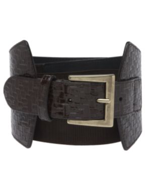 Wide Patent Basketweave Belt: Wide angular fashion belt is joined in front by a narrow strap and antique-look goldtone buckle. Basketweave print patent finished with elastic strap in back. Get this stylish basketweave belt at
