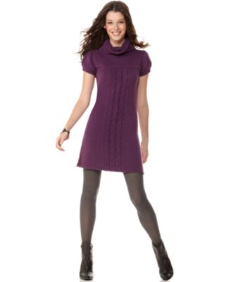 Pink Rose Turtleneck Sweater Dress: This body-skimming sweater dress from Pink Rose features flattering details like a foldover turtleneck, puff sleeves and a silhouette-lengthening cable knit down the front.